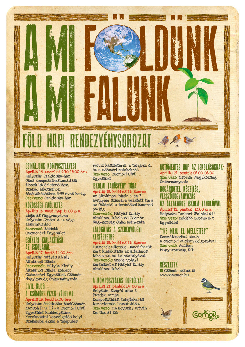 Április közepén 8 napon átívelő rendezvénysorozatra várják az érdeklődőket a Föld napja alkalmából. Az idei rendezvénysorozat önkormányzati és civil összefogással valósul meg, a szervezők között tudhatjuk az önkormányzat mellett a Csömöri Civil Egyesületet, a Mátyás Király Általános Iskolát, a Turnovszky István Kertbarát Kört, a Szakicska-házat, a Szedervölgyi Kertészetet, valamint a Zöldebb Csömörért Egyesületet is.