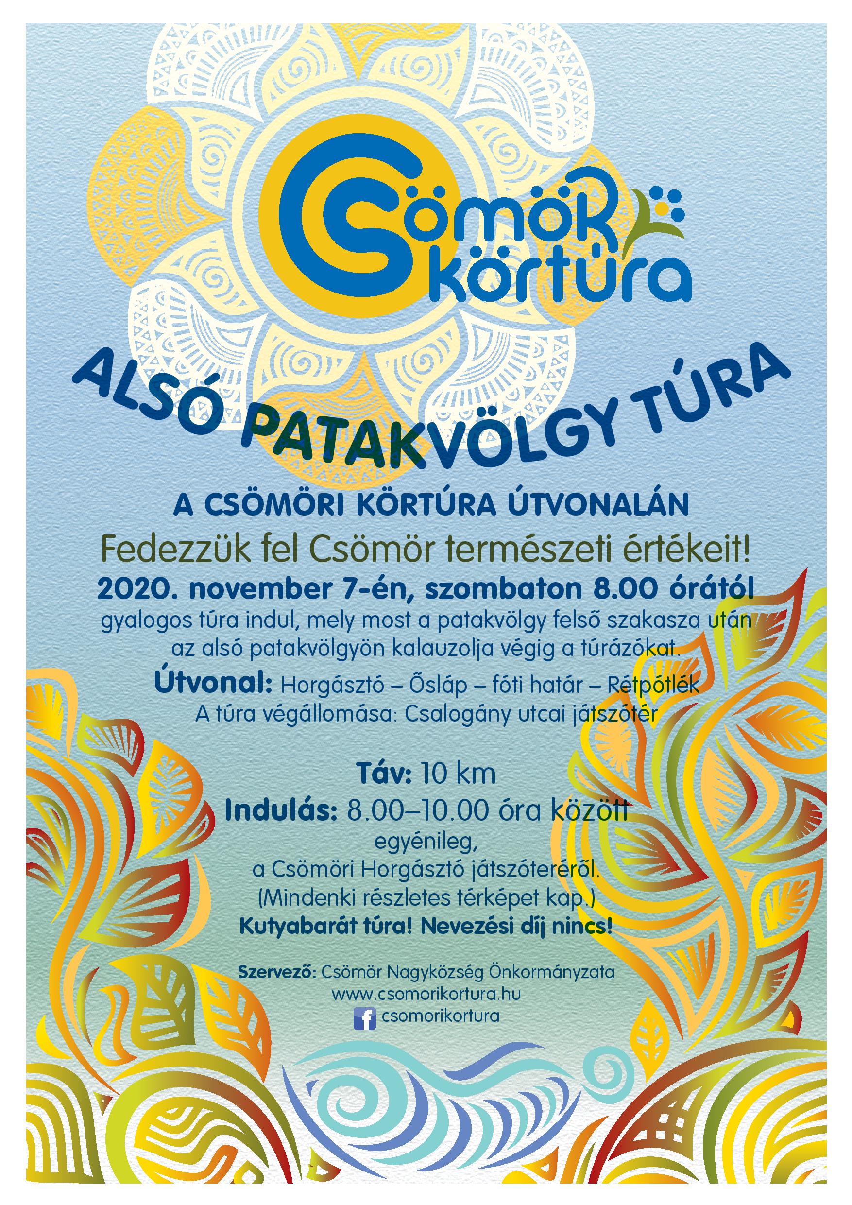 2020. november 7-én, szombaton 8.00 órától gyalogos túra indul a Csömöri Körtúra útvonalán, mely most a patakvölgy felső szakasza után az Alsó-patakvölgyön kalauzolja végig a túrázókat.