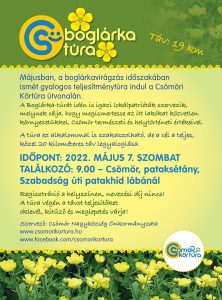 Május 7-én, szombaton 9.00 órától 19 km-es gyalogos teljesítménytúra indul a Szabadság úti patakhíd lábától. A Boglárka-túrát idén is igazi lokálpatrióták szervezik, melynek célja, hogy